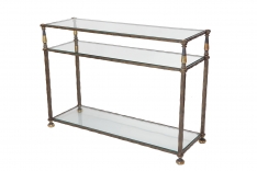 Table basse en fer forgé plein carré martelé avec laitons et 2 plateaux de verre encatsrés. Dans un style assez simple et épuré, ce modèle sera mis en valeur aussi bien dans un univers classique - rustique ou moderne.